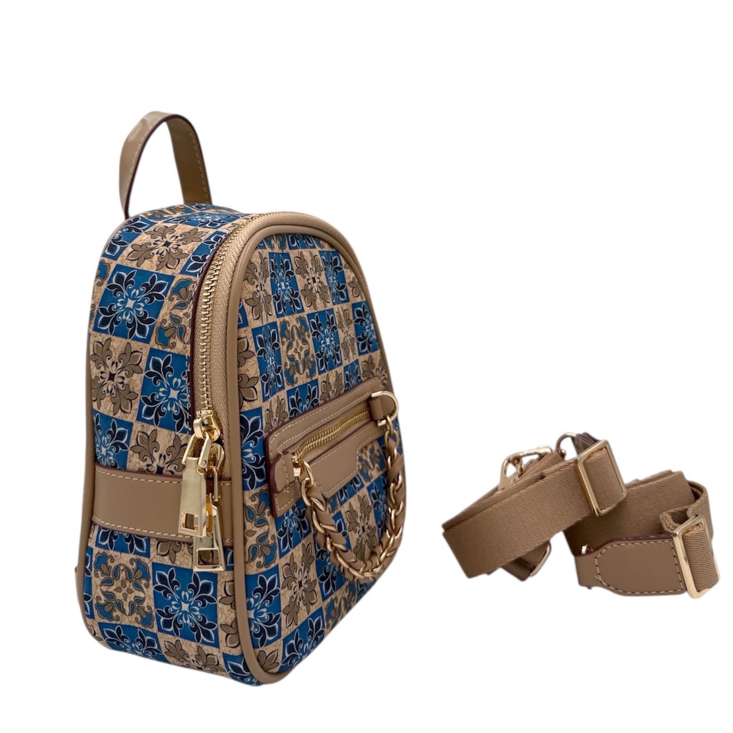 A stylish eco-friendly cork mini backpack with artistic printed patterns. Designed with adjustable straps, a top handle with decorative chain, and a secure zip closure, it’s lightweight, durable, and perfect for everyday outings in sustainable style.