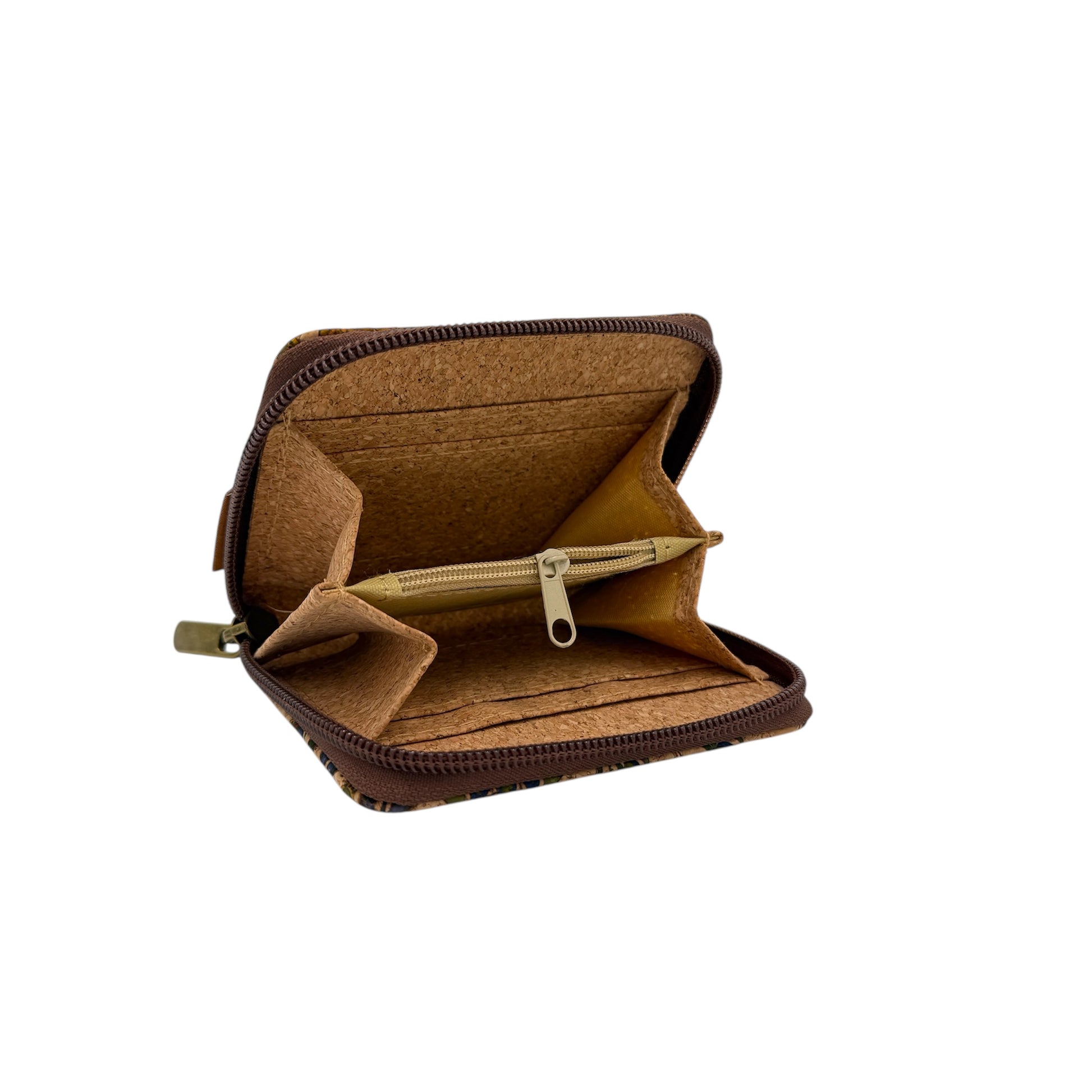 A compact eco-friendly cork mini wallet (11 × 9 × 2 cm) with artistic printed patterns. Features a secure zip-around closure with card slots and a coin pocket—lightweight, stylish, and perfect for everyday use.